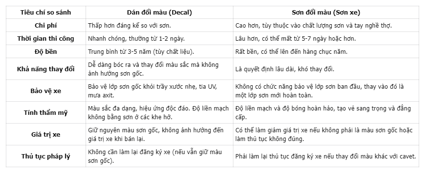 Để giúp bạn đưa ra quyết định phù hợp nhất cho xe của mình, Lê Nguyễn Auto đã tổng hợp bảng so sánh chi tiết giữa hai phương pháp sơn xe và dán đổi màu ô tô.