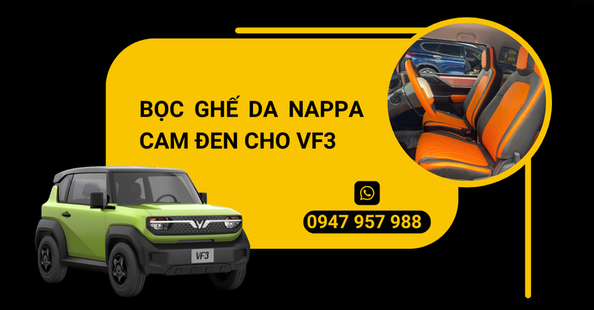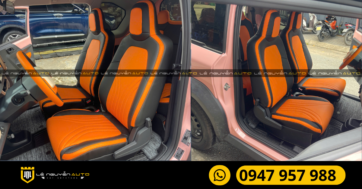 VF3 là mẫu xe điện mini SUV đề cao sự cá tính, hiện đại và tiện dụng. Việc bọc ghế bằng da nappa không chỉ bảo vệ nội thất khỏi bụi bẩn, dễ vệ sinh hơn chất liệu nỉ nguyên bản, mà còn tăng thêm tính thẩm mỹ cao cấp, thể hiện gu thẩm mỹ tinh tế của chủ xe. Sự kết hợp màu Cam Đen mạnh mẽ còn làm nổi bật chất thể thao, năng động, hoàn toàn đồng điệu với tinh thần của VF3.